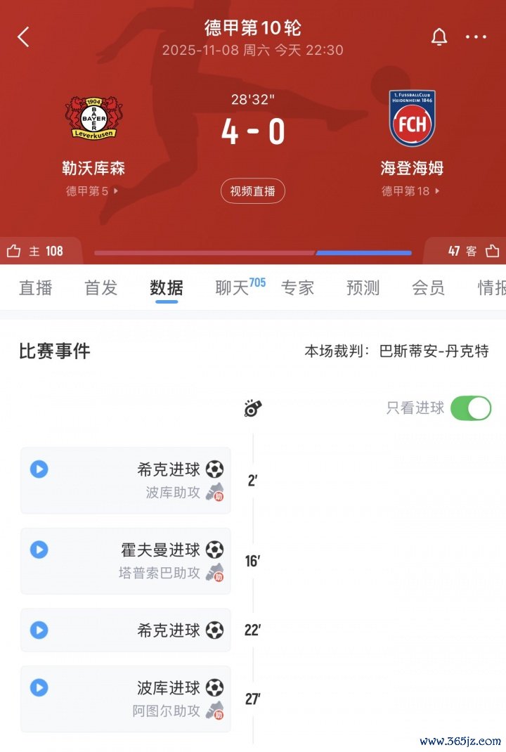 足球总览网-惨案预定?!赛事 开场仅仅27分钟,勒沃库森已经4-0领跑 海登海姆