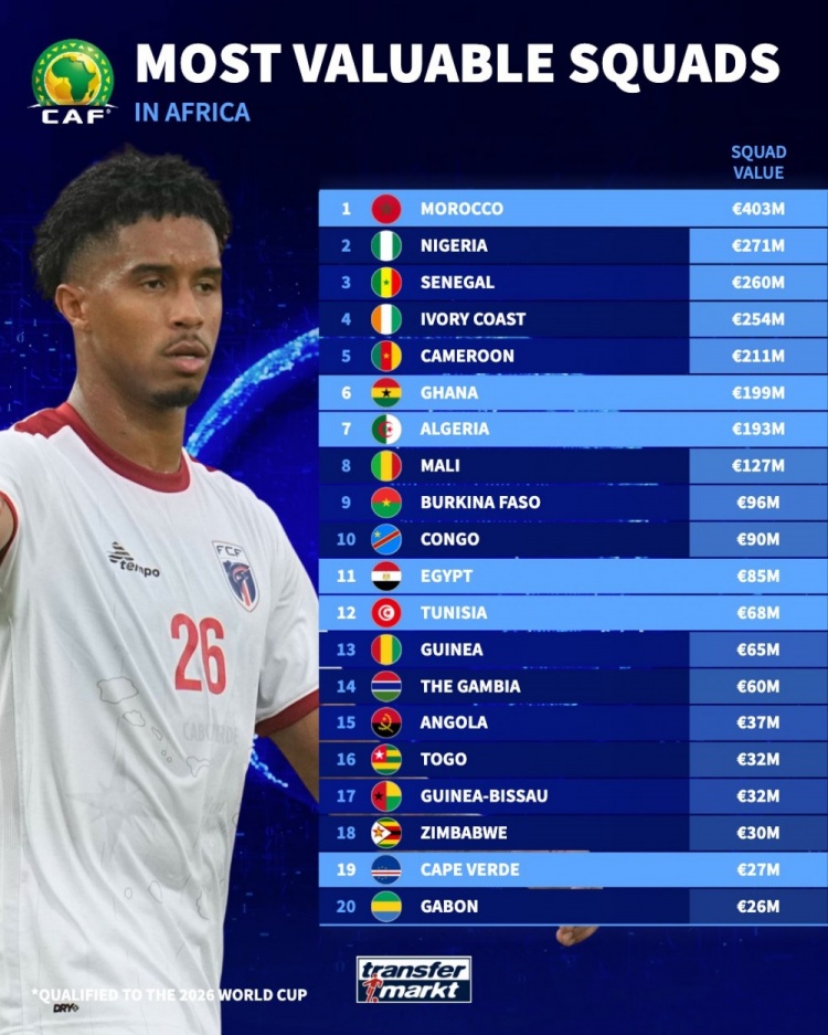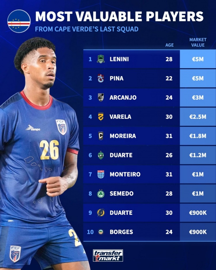 佛得角阵形 总身价2700万欧元,非洲球队之中仅排在第19位,而首位摩洛哥总身价高达4.03亿欧元。佛得角身价最高的球员为莱尼尼、皮纳,两人德回转 价均为500万欧元,仅8名球员身价达到100万欧或以上。