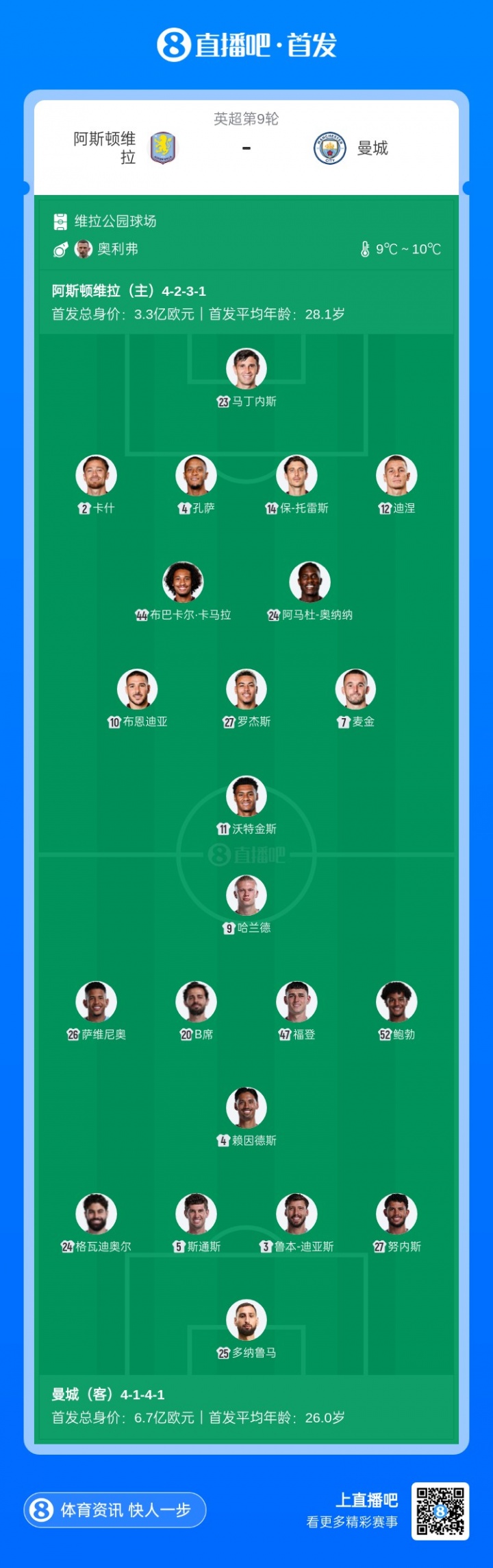 10月26日讯 北京时间今晚22点,英超第9轮,曼城客场应战 对阵阿斯顿维拉,赛前双方公布杆位阵形 。曼城方面,欧洲杯直播竞技状态 火热的哈兰德和福登领衔杆位;维拉方面则由大马丁和沃特金斯坐镇攻防两端。