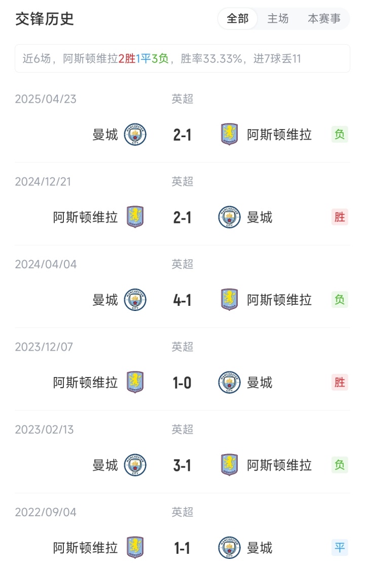 截至赛前,维拉3胜3平3负积12分,排名英超积分榜第12;曼城5胜1平2负积16分,排名英超积分榜第4。