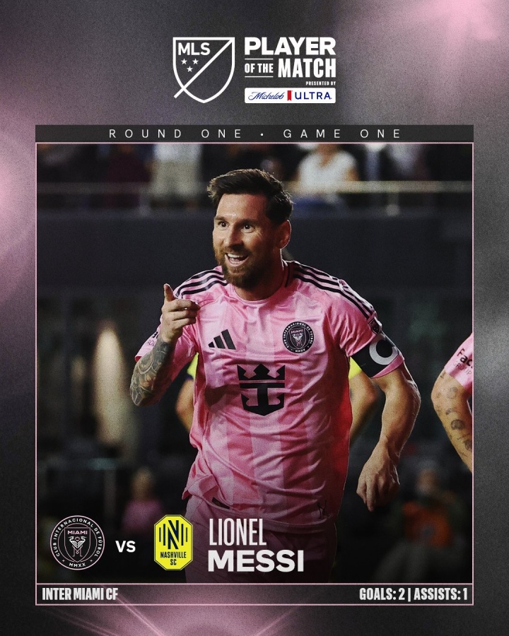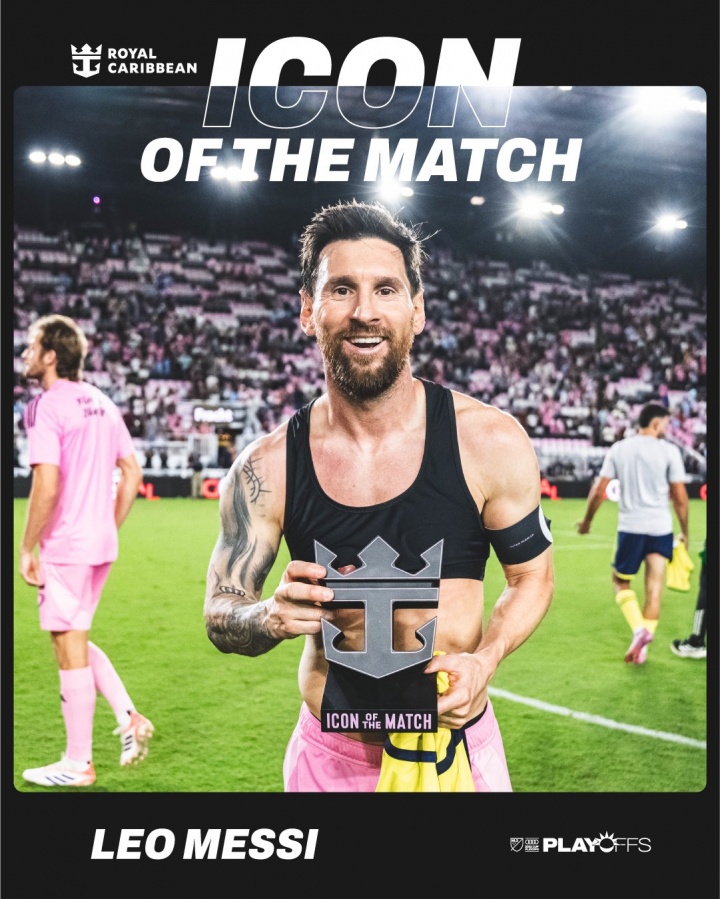 10月25日讯 美职联季后赛首场,梅西连进两球,迈阿密3-1纳什维尔。美职联官方宣布梅西当选全场最佳球员。
