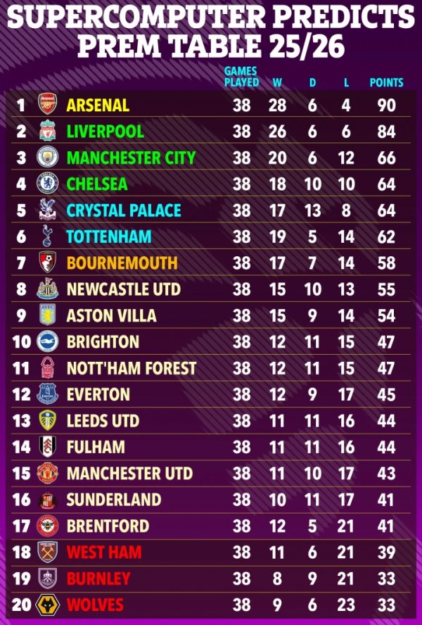 在线扑克新手教程 09月29日讯 英超第6轮战罢,超级计算机根据各支球队的积分和表现情况,以及球队的阵形 ,预测了本赛季英超的最终排名。阿森纳将以90分夺得英超 ...