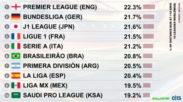 英超比赛在线直播 9月29日讯 CIES盘点各职业联赛 高速移动距离 占比排名,英超居首,德甲第二,西甲仅第八。(高速跑动定义:>15公里/小时) 各职业联赛 ...